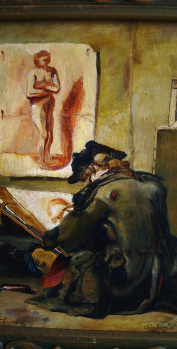 5 années de cours de restauration de tableau m'ont permi de me rendre compte que ne sachant pas peindre en technique ancienne, il m'était difficile de monter une retouche illusionniste invisible. Il était évident à partir de ce constat qu'une nouvelle formation s'imposait ! J'ai donc passé 11 années à travailler plusieurs heures par semaine en atelier de cours et encore de nombreuses heures en travail libre à la maison. La production d'exercices est très importante et je ne vous présente que les plus interéssants: